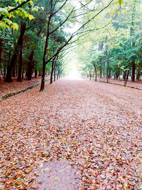 雨音が変わった葉の絨毯、帰りの参道です。